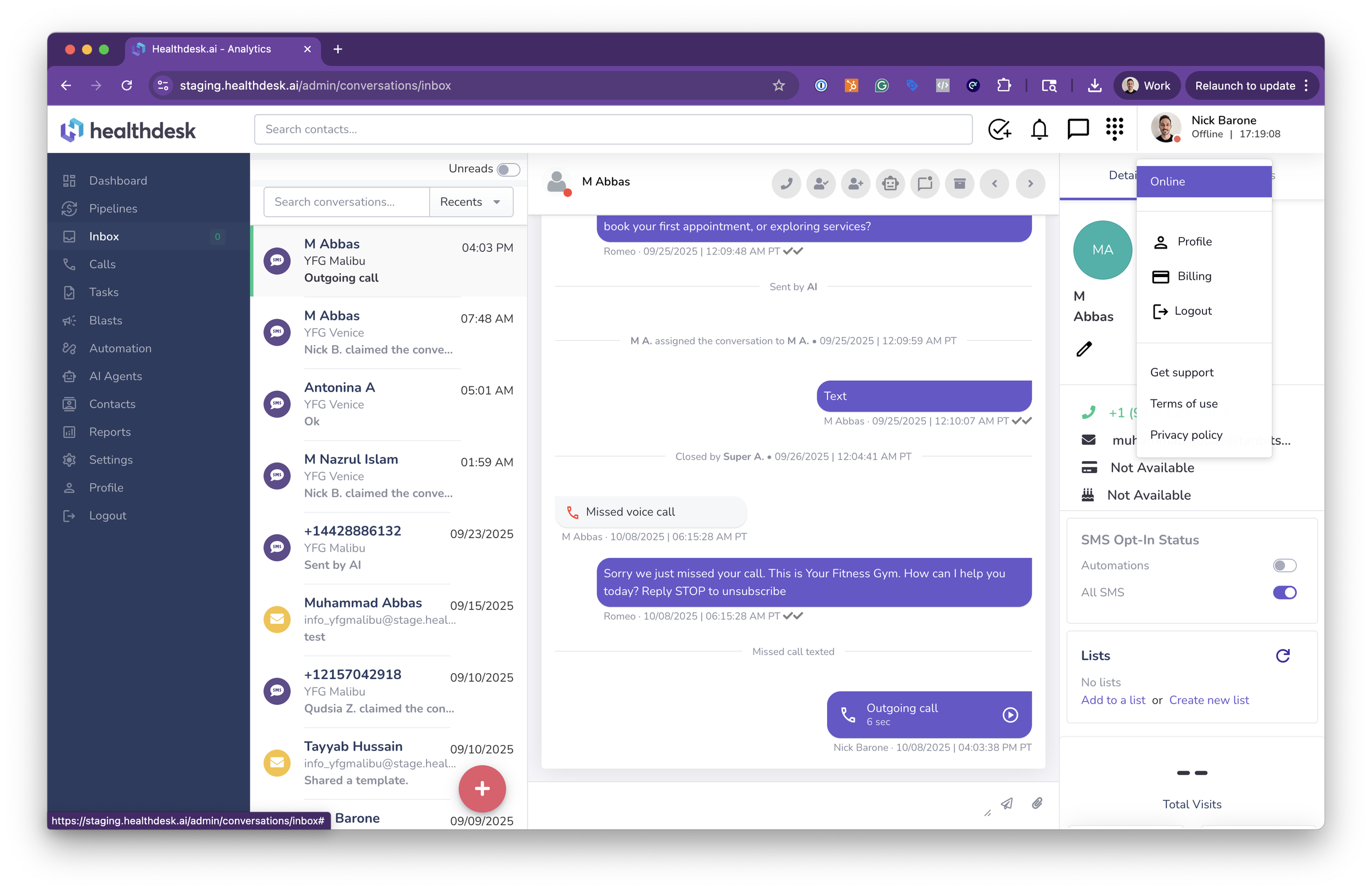 With HealthdeskAI, you can make and receive client phone calls directly from the Inbox. This feature allows for seamless communication for both inbound and outbound calls, helping you efficiently manage leads, handle follow-ups, and maintain client conversations without the need to switch between different tools.